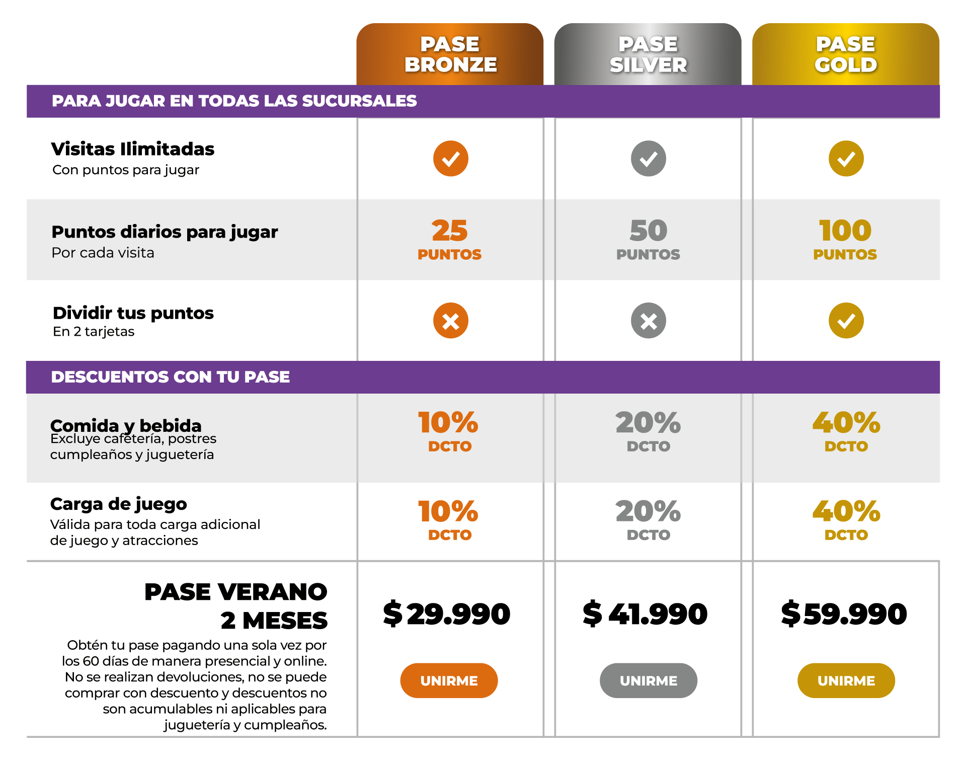 El Pase de Verano es una versión de 60 días del Pase Chuck E. Fan con el que podrás vivir un universo de entretención en todos los Chuck E. Cheese de Chile. Es la mejor opción para Comer, Jugar y Ahorrar al mismo tiempo. Dependiendo de tu pase, tienes puntos diarios de juego y descuento en comida, bebida, carga extra de juego.